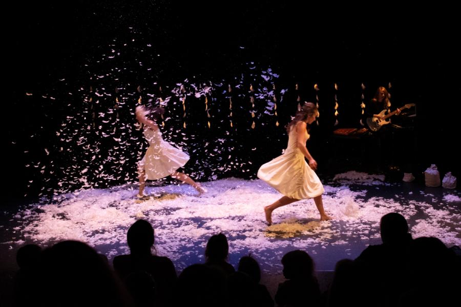 Deux danseuses et une musicienne sculptent l’espace et le temps ensemble. La douceur et la légèreté de la plume sont omniprésentes, et la création musicale nous plonge dans une atmosphère hypnotique et féerique. L’intimité des représentations invite les spectateurs, même les tout-petits, à un voyage intérieur poétique.